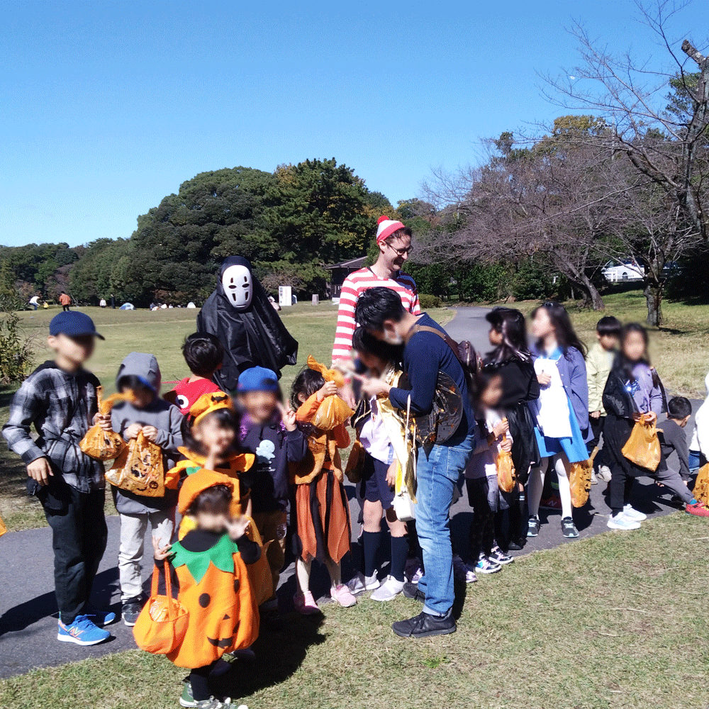 スクールをでて屋外で体験する学びを年に1~2回ほど行っています。スクール開校より毎年行っているハロウィンイベントではこどもたちが仮装をして集合します。